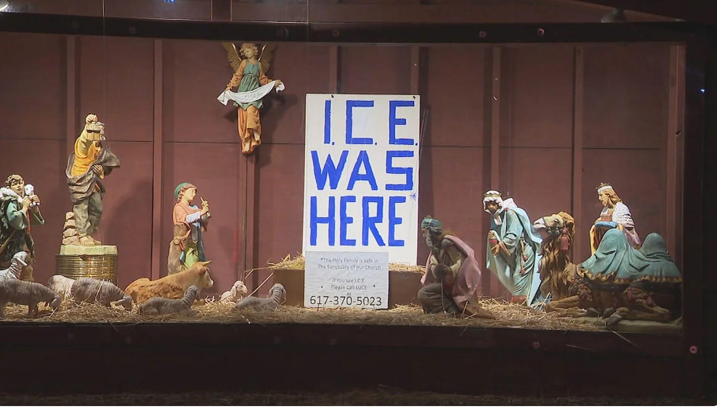 Away in a manger, within the nativity scene outside St. Susanna’s Parish in Dedham, Massachusetts, there is an emptiness where we would expect to find the Baby Jesus and his parents, Mary and Joseph. In the place of the Holy Family, there is a sign reading, “ICE Was Here.” The St. Susanna’s nativity display serves as a shocking but necessary piece of political commentary at a time when Christians around the world honor a homeless, refugee family fleeing the oppression of a violent, narcissistic tyrant hellbent on snatching away their newborn child. It’s often said that the Christmas story is timeless. But the message of Christ’s birth seems more timeless and more timely than ever in 2025, as our nation comes to grips with the damage wrought by the first year of Donald Trump’s Second Administration.