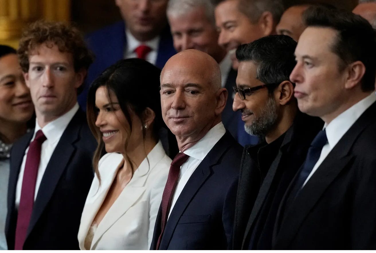 Whether DeepSeek is a genuine threat to America’s AI dominance or a PSYOP by the Chinese government to inflict damage to our economic confidence remains to be seen. What we do know is that the Collusionist narrative of AI maximalism that brought America’s tech titans to Trump’s inauguration looks more vulnerable than ever. If the AI bubble bursts (after CEOs and Congress have already cashed out handsomely) and inflicts economic pain on average Americans, a focused political attack must be launched against the Billionaire Class who sold us on a self-aggrandizing narrative and sold their souls to Trump in the process.
